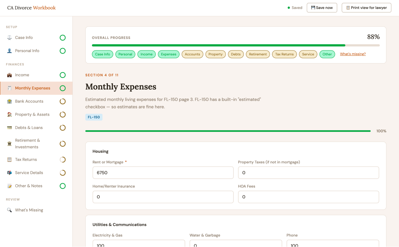 California Divorce Disclosures Helper